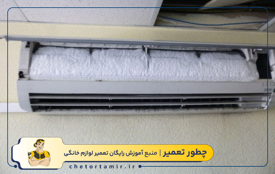 - پنل داخلی را باز کنید و به کویل های فلزی دقت کنید. اگر یخ زدگی مشاهده کردید، ابتدا صبر کنید تا یخ ها ذوب شوند.